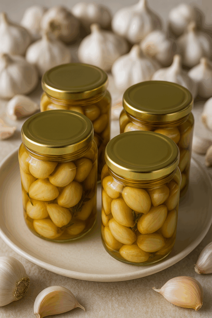 Otwórz każdy słoik i dolej oliwy, tak aby całkowicie przykryła czosnek—tym sposobem czosnek jest zakonserwowany i nie ciemnieje.