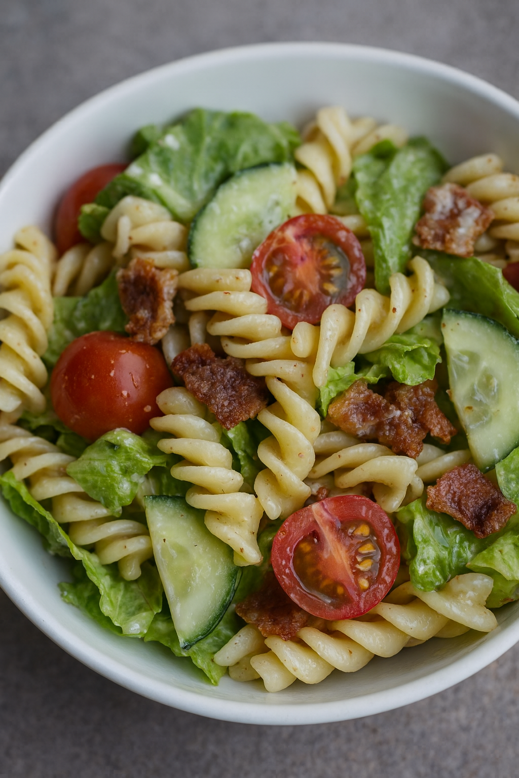 Sałatka makaronowa z boczkiem, ogórkiem i pomidorkami