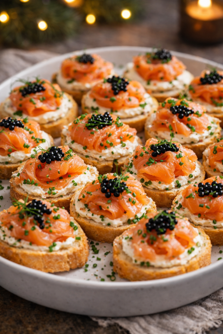 Mini kanapki z łososiem wędzonym, kremem serowym i kawiorem
