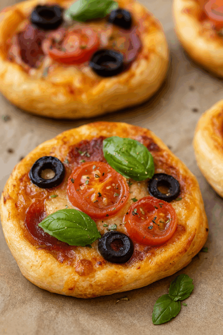 Mini pizze z oliwkami, pomidorami i bazylią