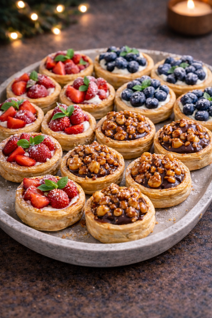 Mini tartaletki z ciasta francuskiego – trzy warianty (truskawki, borówki, karmel z orzechami)