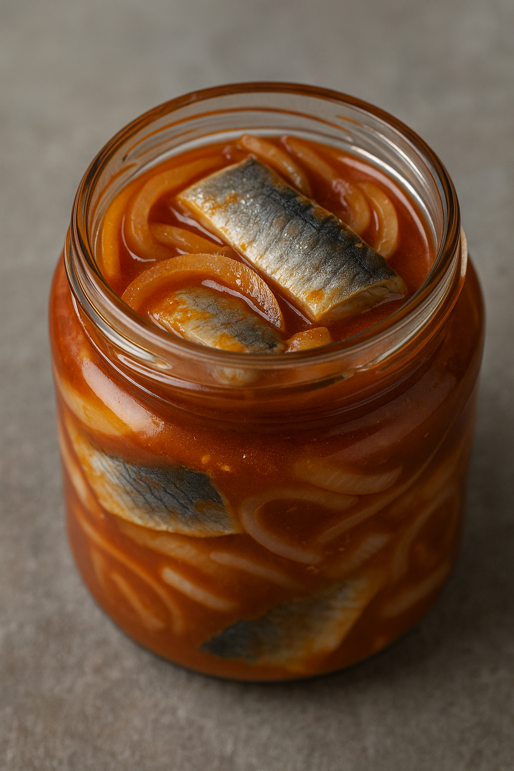 Składniki: 400 g filetów śledziowych a’la matjas (solonych) 2 duże cebule 3 łyżki koncentratu pomidorowego 200 ml passaty…