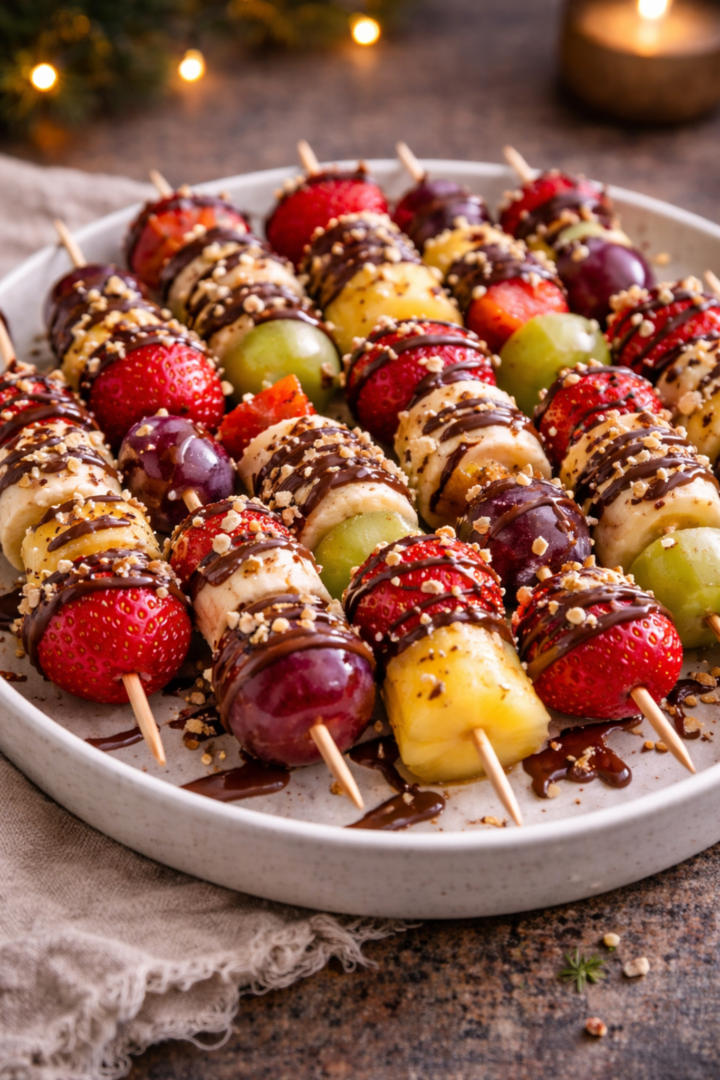 Owocowe koreczki z bananem, truskawkami i winogronami w czekoladzie