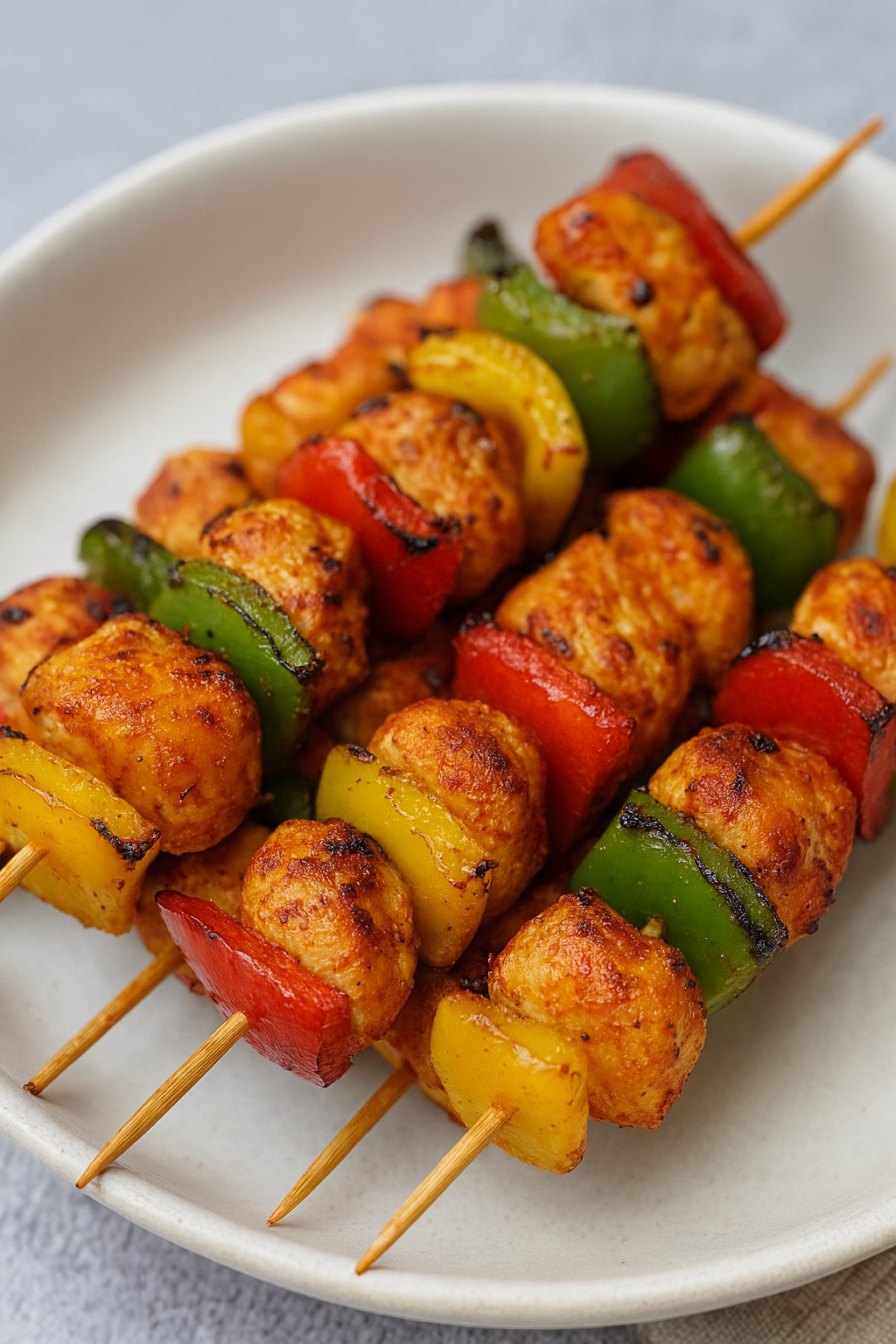 Składniki: 500 g piersi z kurczaka (lub filetu z indyka) 1 czerwona papryka 1 żółta papryka 1 zielona…