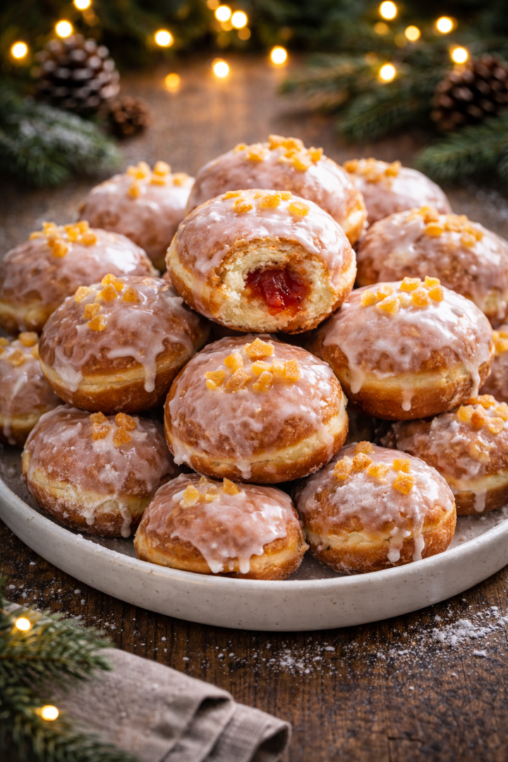 Polej pączki lukrem i posyp skórką pomarańczową.