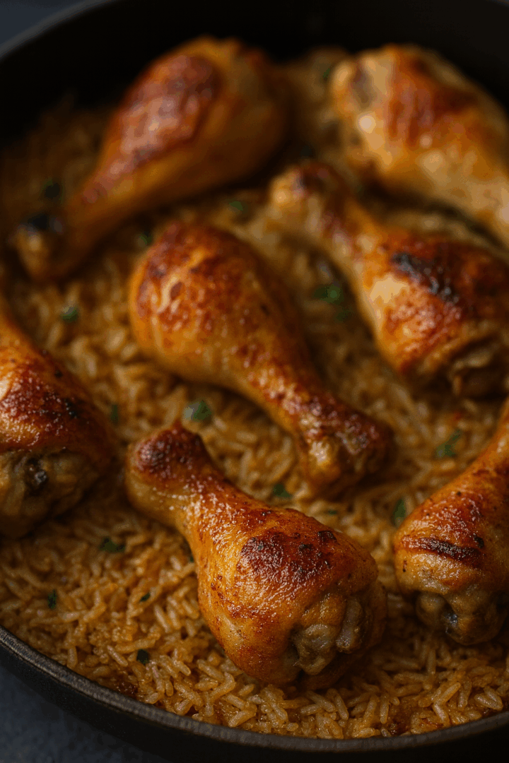 Piecz przez 35–40 minut, aż ryż wchłonie cały płyn, a kurczak będzie miękki i soczysty.