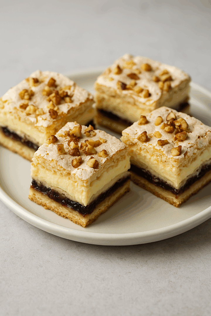 Na pierwszy blat (bez orzechów) nałóż cały krem budyniowy.