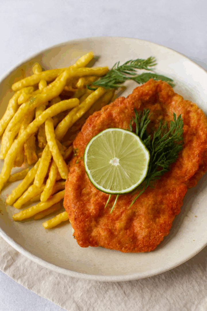 Kotlet udekoruj plasterkiem limonki i gałązką koperku.