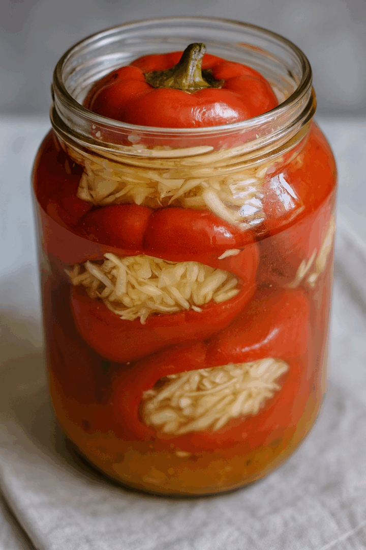 Papryki ułóż ciasno w wyparzonych słoikach, przykryj odciętą „czapeczką”.