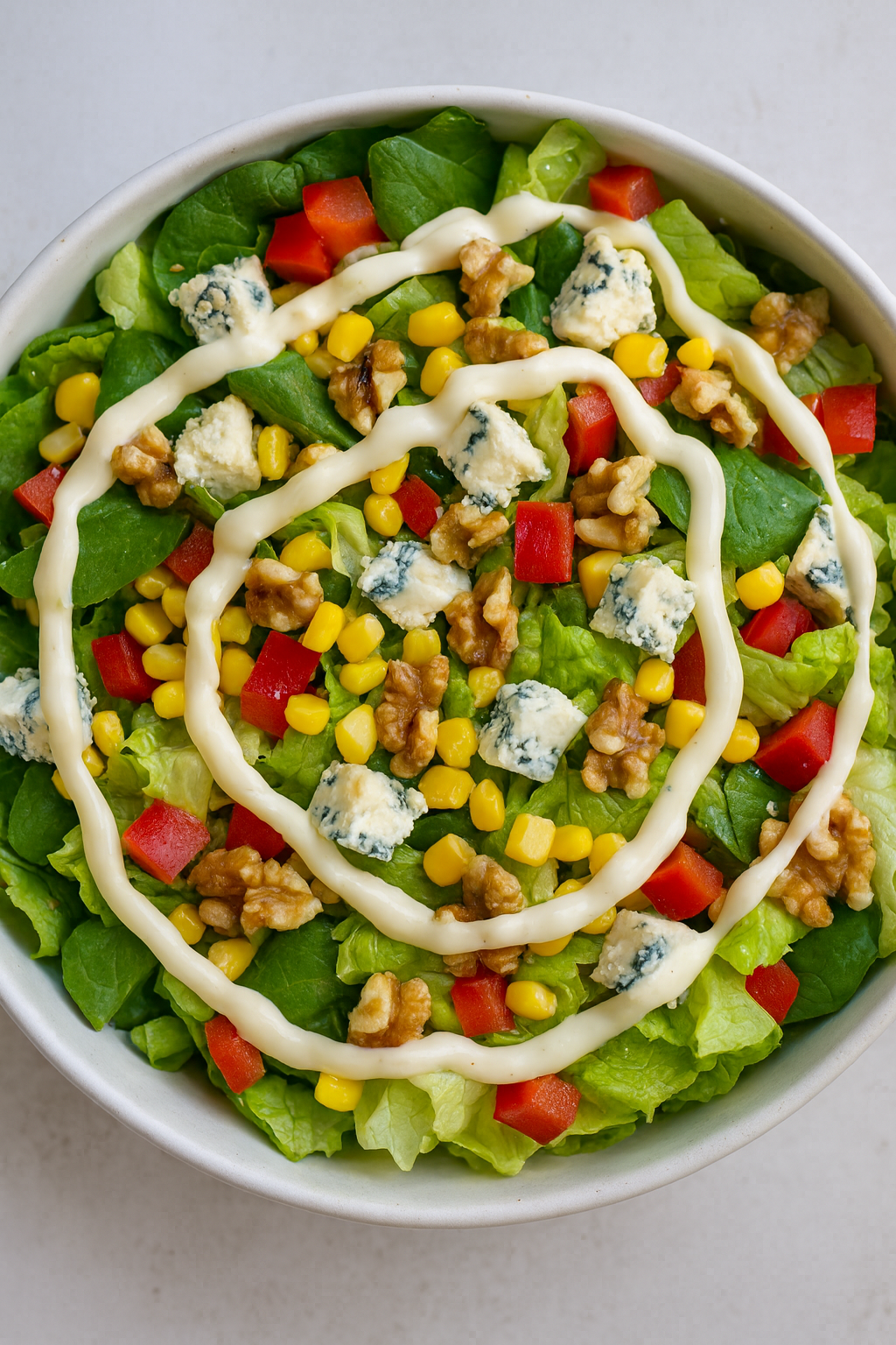 Sałatka z serem pleśniowym, orzechami włoskimi i kukurydzą