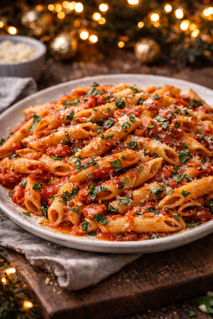 Penne w sosie pomidorowym z ziołami i parmezanem