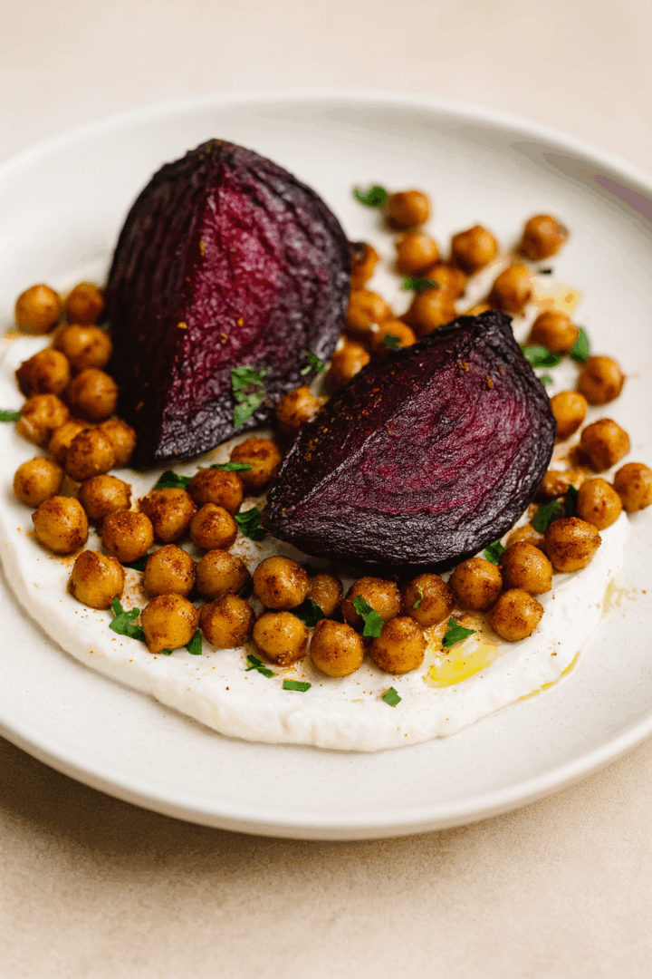 Pieczone buraki z chrupiącą ciecierzycą na kremowym puree z jogurtu i sera