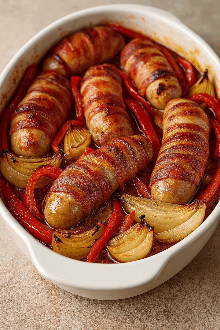 Pieczone kiełbaski zawijane w boczek z papryką i cebulą