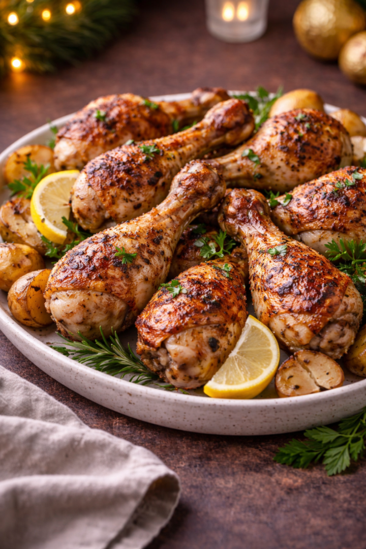 Pieczone pałki z kurczaka z ziemniakami, cytryną i ziołami.