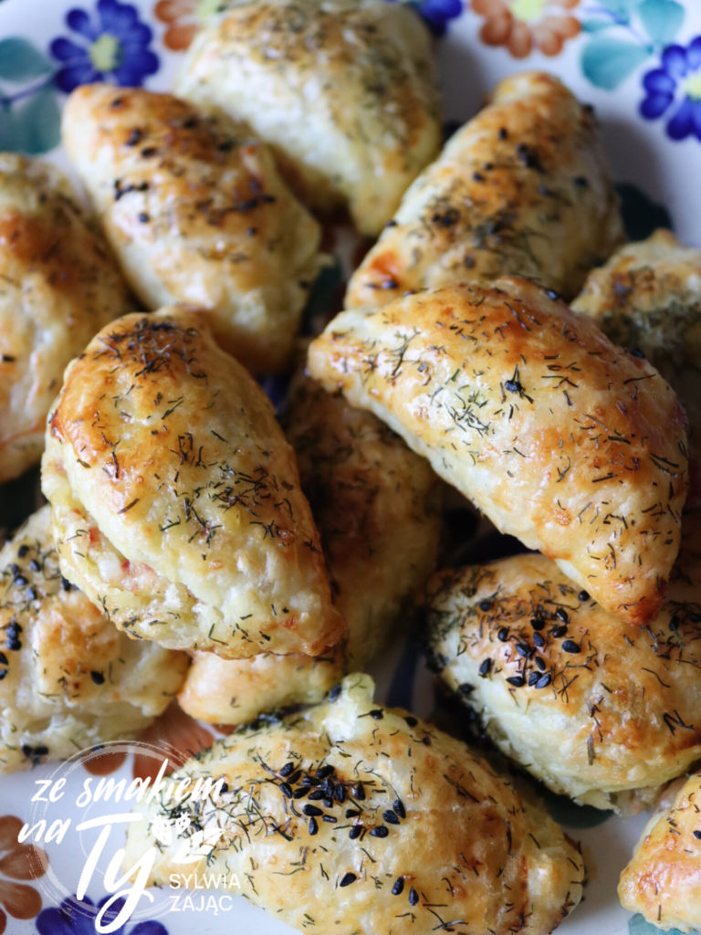 Pieczone pierożki z ciasta francuskiego nadziewane serem, passatą i kurczakiem, posypane czarnuszką i suszonym koperkiem to pyszna, lekka przekąska, która świetnie sprawdzi się na imprezach, jako część obiadu lub po prostu na szybki obiad. Ciasto francuskie jest lekkie i chrupiące, a nadzienie – bogate w smaki kurczaka, pomidorowej passatty i aromatycznych przypraw.
