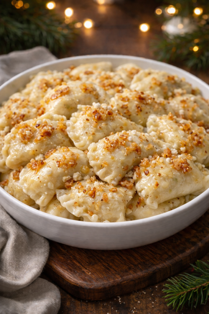Pierogi ruskie z okrasą ze skwarków i cebuli