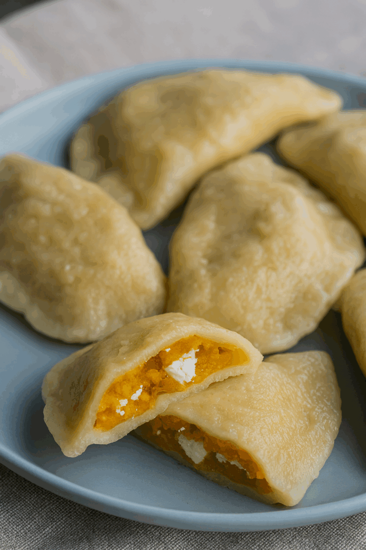 Farsz: Puree z dyni wymieszaj z rozdrobnionym serem, żółtkiem i przyprawami. Dopraw do smaku (z fetą farsz będzie bardziej słony i pikantny).