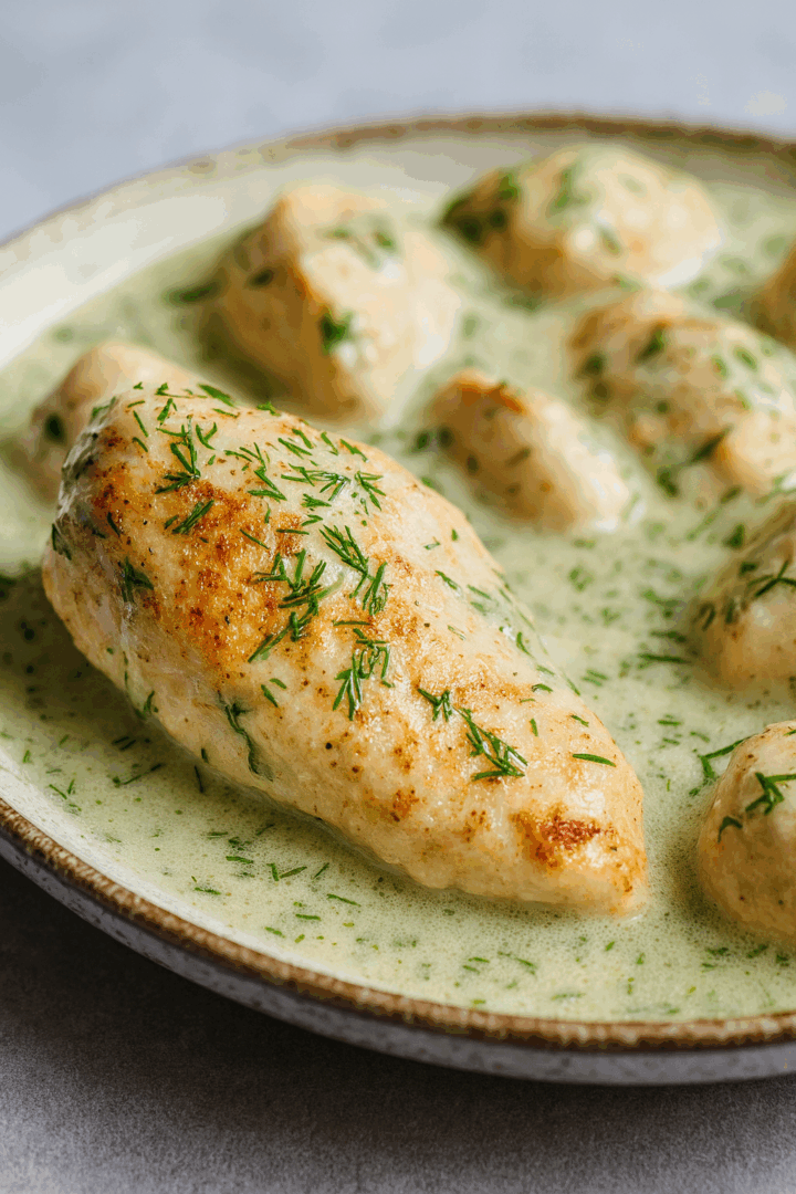 Piersi z kurczaka umyj osusz i lekko rozbij tłuczkiem aby wyrównać grubość. Oprósz solą i pieprzem następnie obsmaż na oleju z obu stron na złoty kolor. W garnku roztop masło wsyp mąkę i przygotuj jasną zasmażkę. Wlej bulion energicznie mieszając a następnie dodaj śmietankę i gotuj aż sos zgęstnieje. Do sosu włóż podsmażone piersi z kurczaka i duś pod przykryciem około 10–15 minut. Na koniec dodaj świeży koperek wymieszaj i dopraw solą i pieprzem. Podawaj z ziemniakami ryżem lub kaszą.