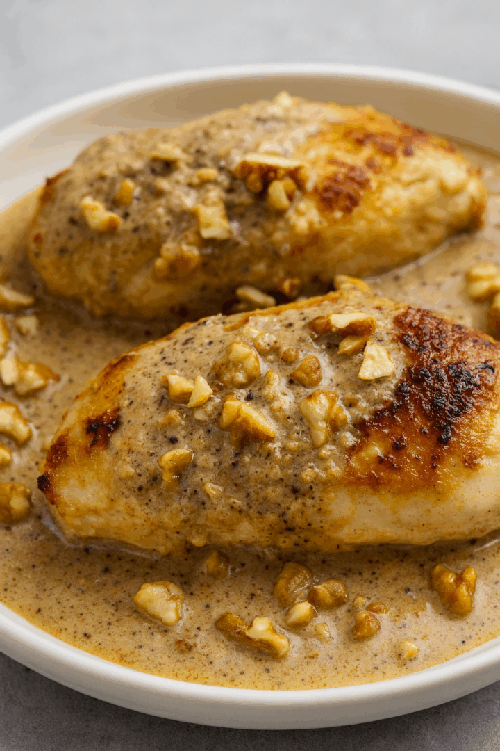 Włóż z powrotem kurczaka, duś na małym ogniu 10–15 minut, aż mięso będzie soczyste, a sos zgęstnieje.