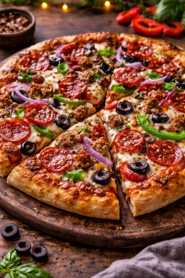 Pizza z pepperoni, mięsem mielonym, oliwkami i papryką