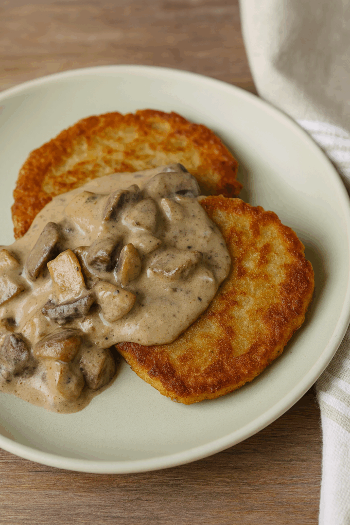 Na talerzu ułóż 2–3 placki ziemniaczane, polej sosem grzybowym. Można też dodać kwaśną śmietanę jako kontrast dla smaku.