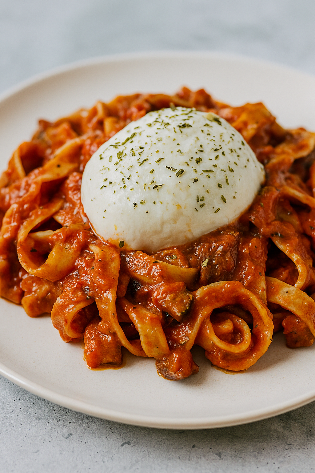 Makaron z sosem z pieczonych warzyw i burratą