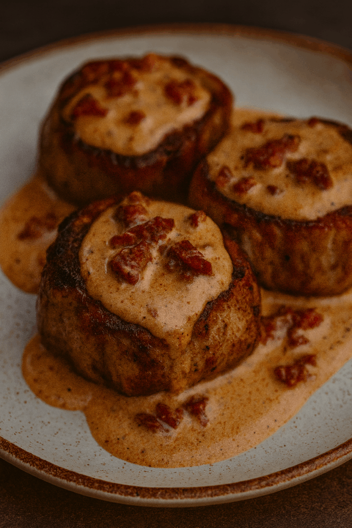 Włóż obsmażone medaliony do sosu i duś całość na małym ogniu przez ok. 5–6 minut, aż mięso będzie soczyste, a sos zgęstnieje.