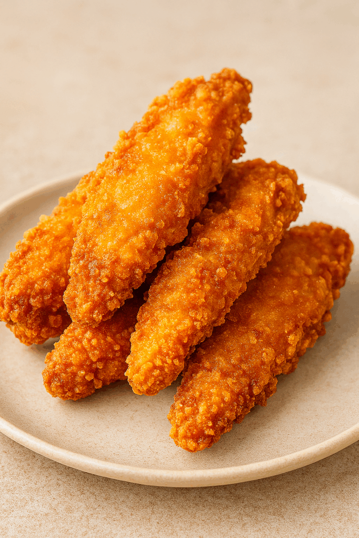 Smaż paski partiami 4–5 min, aż panierka będzie złocista i chrupiąca, a mięso soczyste.