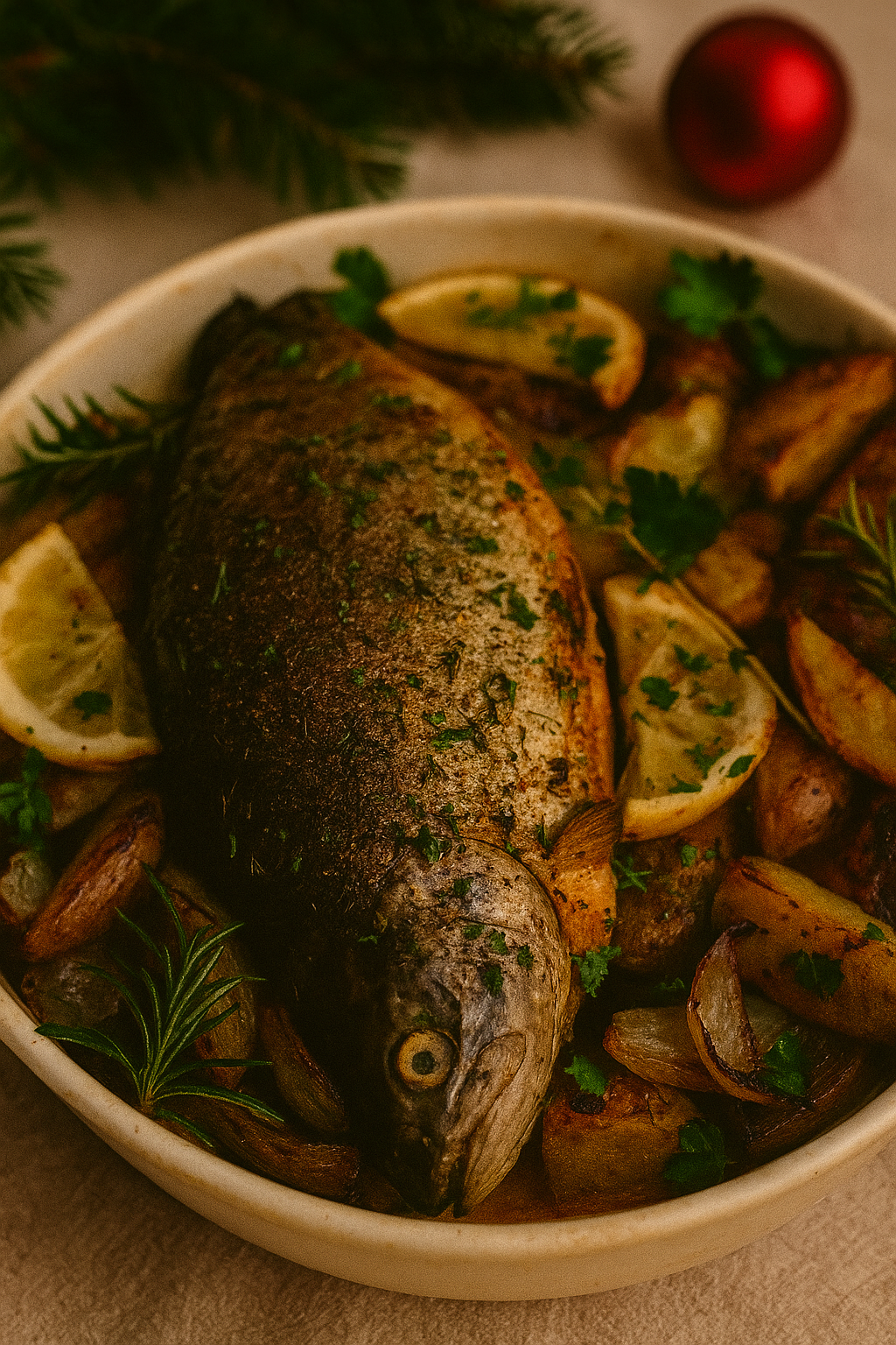 Świąteczny pstrąg pieczony z ziemniakami i cytryną