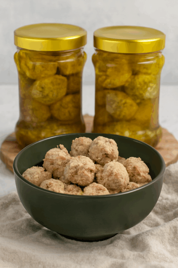 Na patelni rozgrzej oliwę z oliwek. Smaż kulki mięsne na złoty kolor z każdej strony, ale nie muszą być całkowicie usmażone, ponieważ będą jeszcze pasteryzowane w zalewie.