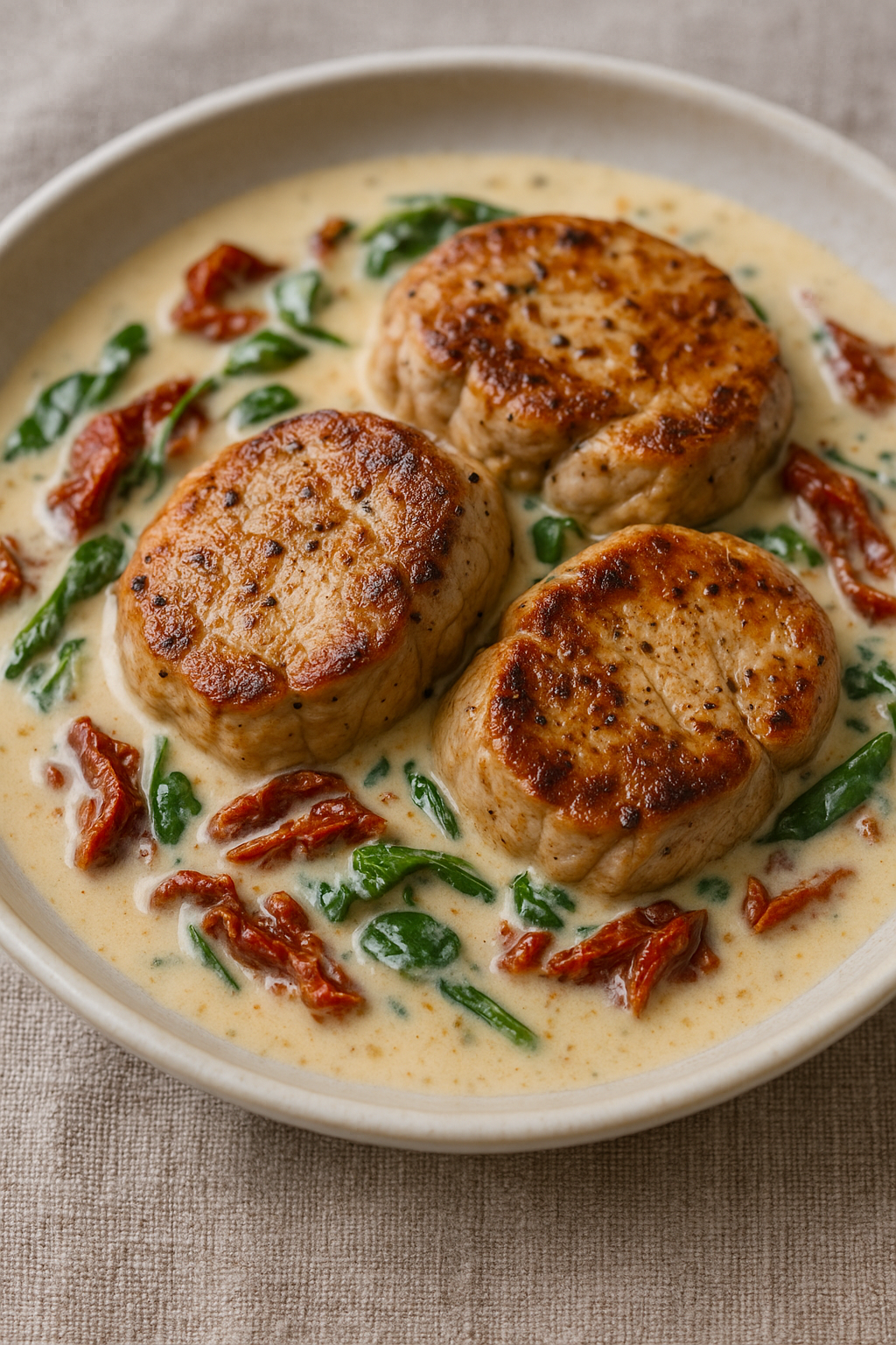 Polędwiczki wieprzowe w sosie śmietanowym ze szpinakiem i suszonymi pomidorami