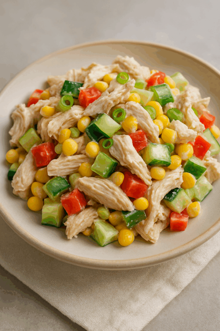 Mieszanie – w misce połącz kurczaka, kukurydzę, paprykę i ogórka. Dodaj majonez (lub jogurt), wymieszaj. Dopraw solą i pieprzem.