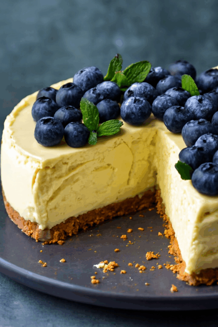 Udekoruj sernik świeżymi borówkami i gałązkami mięty. Możesz również posypać go delikatnie cukrem pudrem