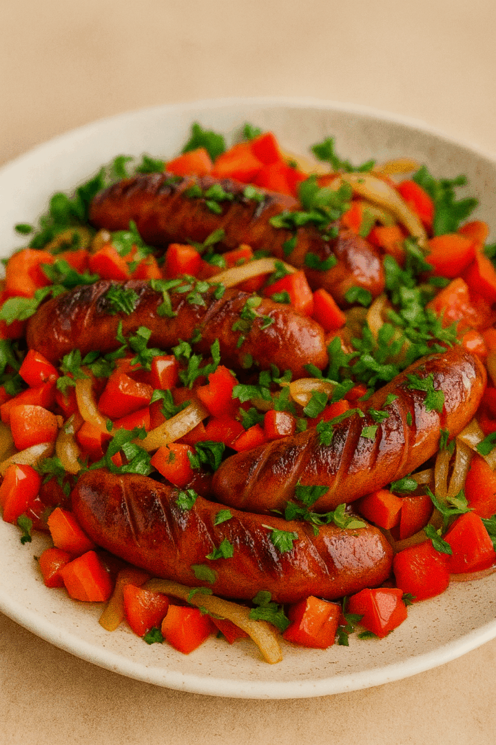 Przepis na śniadaniowe grillowane kiełbaski z papryką i cebulą