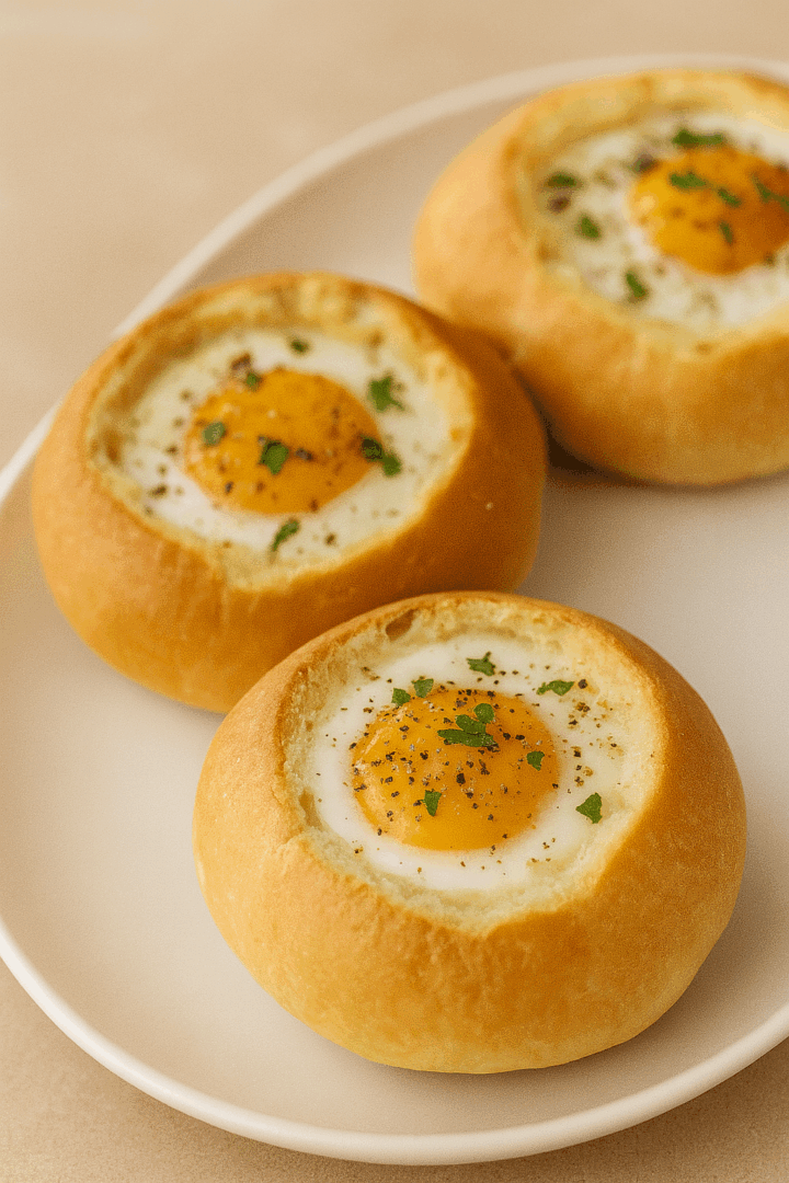 • Z dodatkami: przed wbijaniem jajka na dno bułeczki włóż plasterek szynki lub kiełbaski, posiekane warzywa (papryka, cebula), pieczarki czy szpinak.