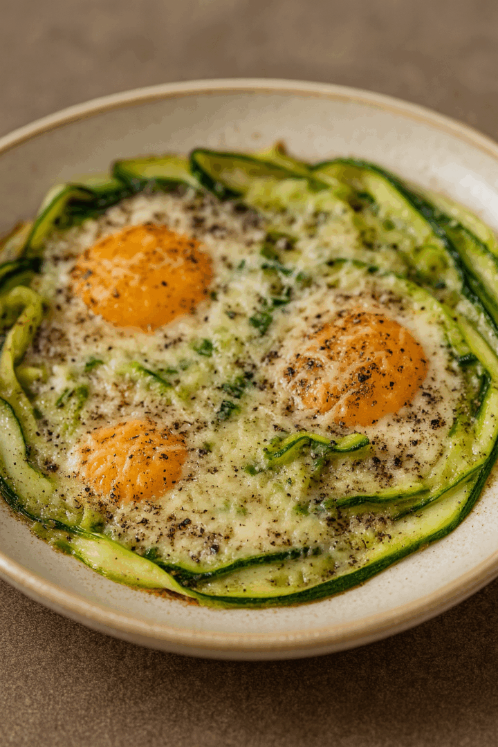 Wstaw patelnię do piekarnika nagrzanego do 180 °C (góra–dół) i zapiekaj 12–15 min, aż białka się zetną, a ser lekko się zarumieni.