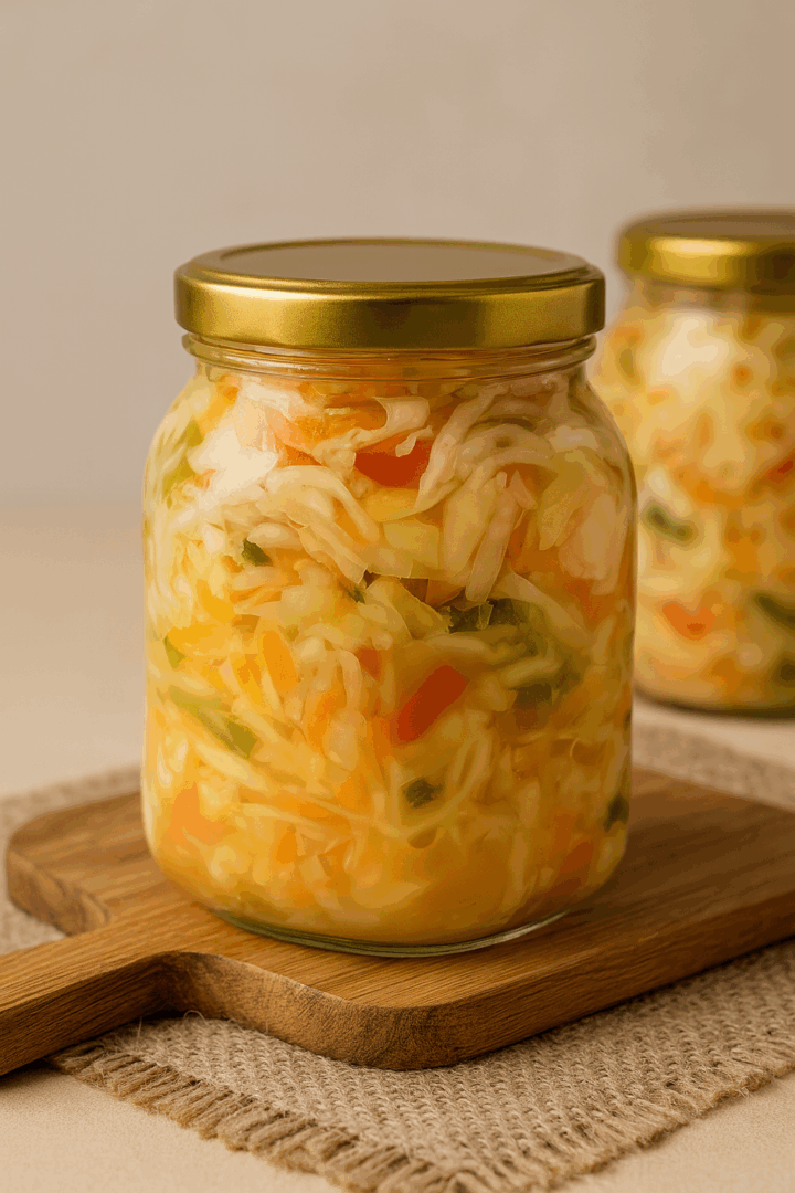 Na dno każdego słoika wsyp trochę marchewki, czosnku i cebuli, następnie warstwę kapusty, papryki i znów marchewki. Układaj warstwowo, lekko ubijając, by wypuścić pęcherzyki powietrza.