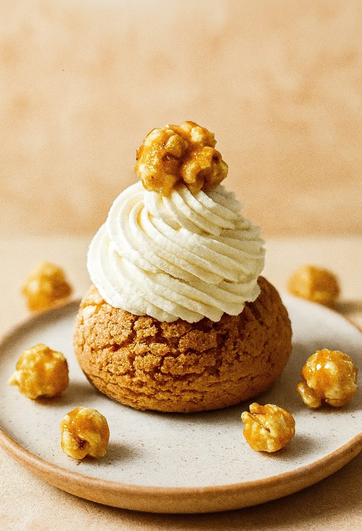Ptysie z kruszonką craquelin, kremem śmietankowym i dekoracją z karmelizowanego popcornu