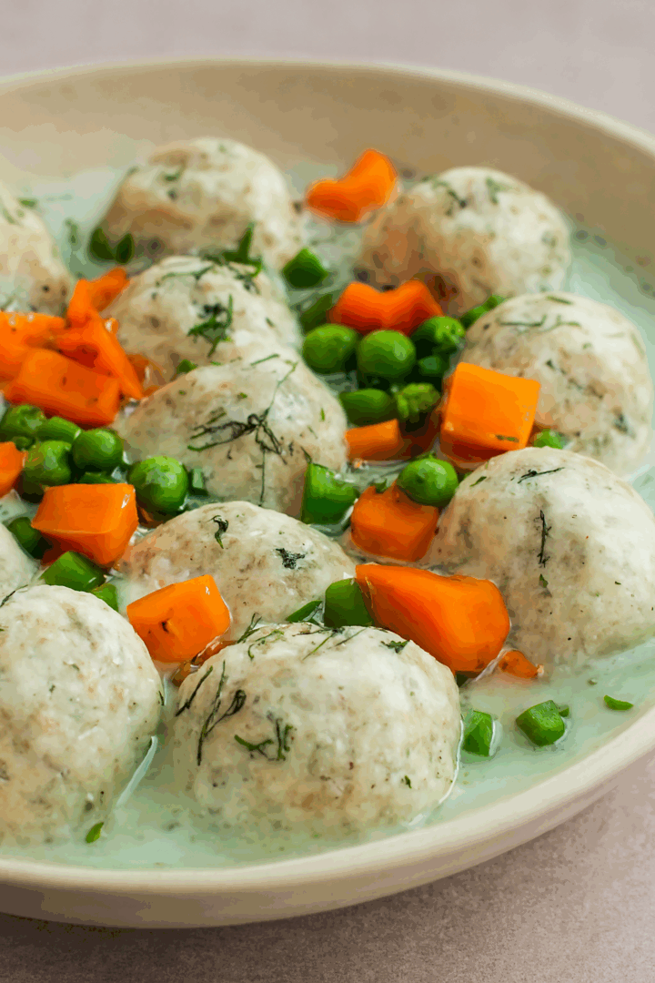 Pulpety drobiowe w sosie koperkowym z marchewką i groszkiem.