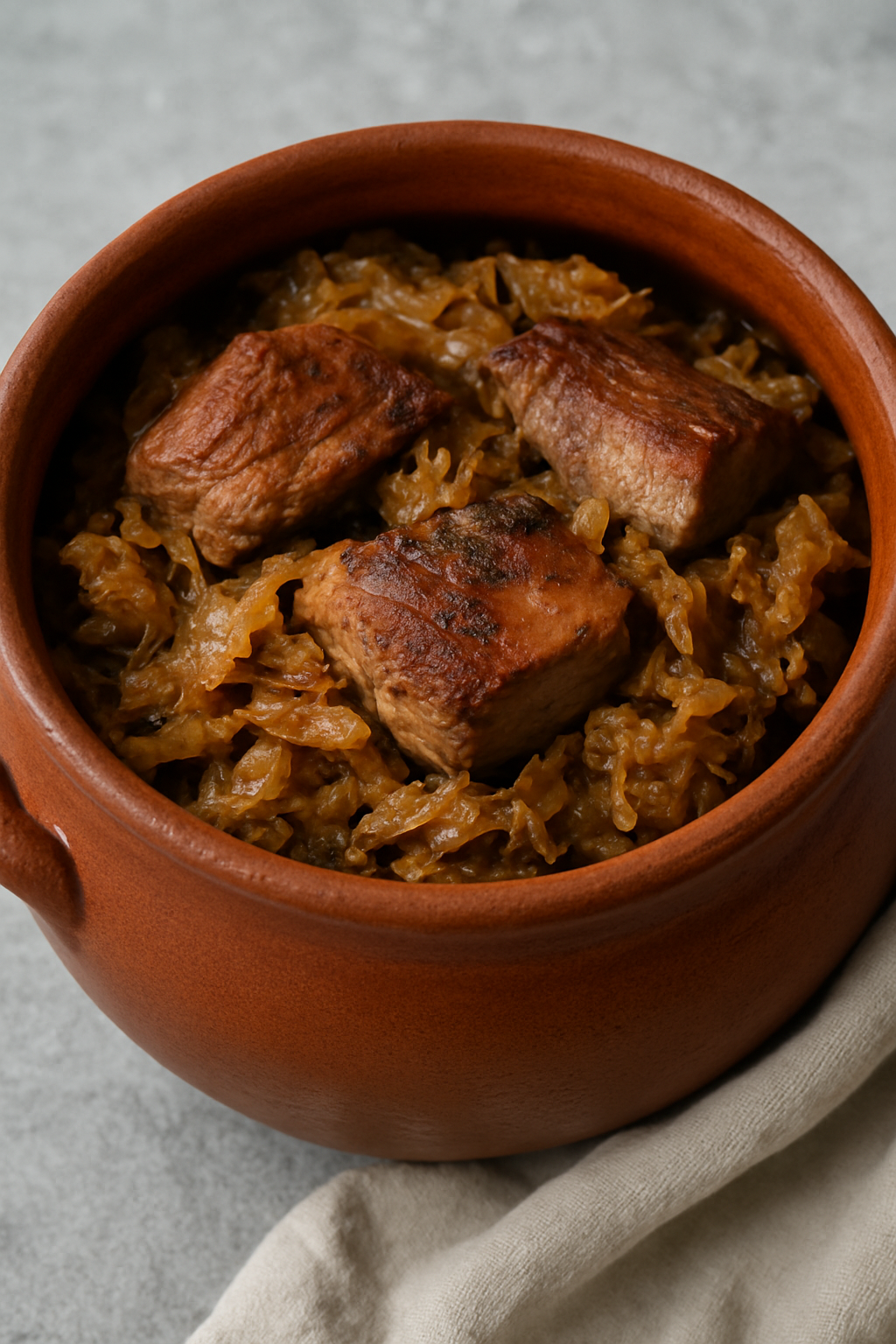 Bigos z dużymi kawałkami mięsa i kiszonej kapusty