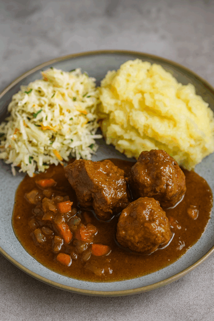 Pulpety w sosie z puree ziemniaczanym i surówką z kapusty