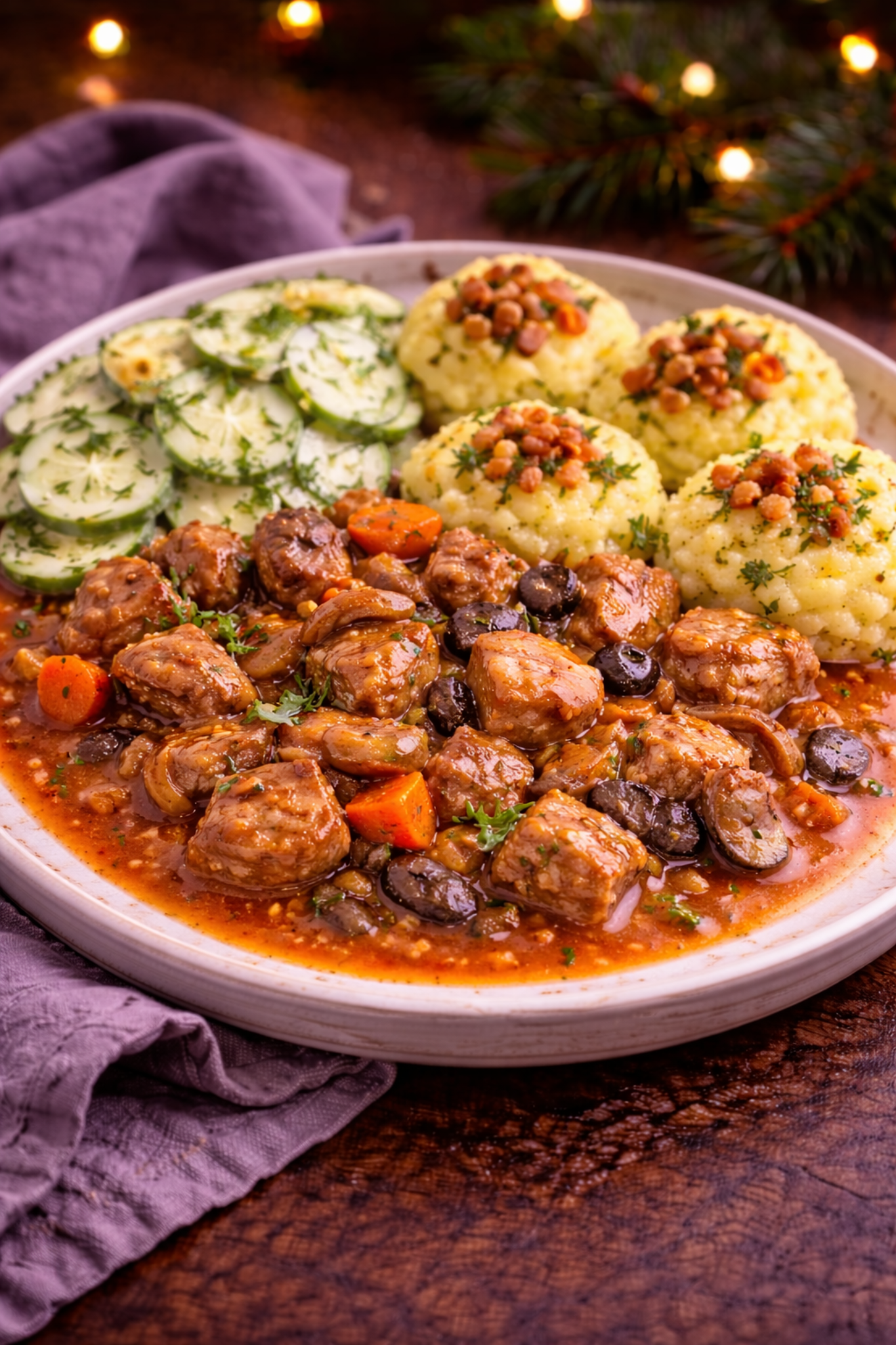 Gulasz z kurczaka w sosie pomidorowym z oliwkami (z puree ziemniaczanym i mizerią)