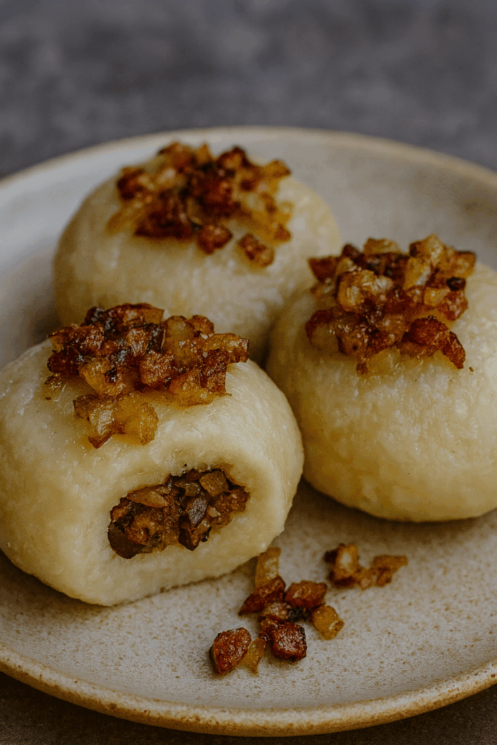 Podawaj polane podsmażoną cebulką ze skwarkami lub boczkiem.