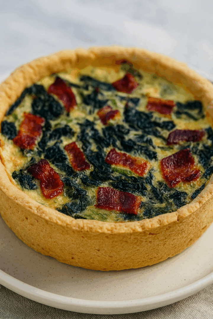 Na podpieczony spód wyłóż szpinak, boczek, a następnie zalej masą jajeczno-śmietankową.