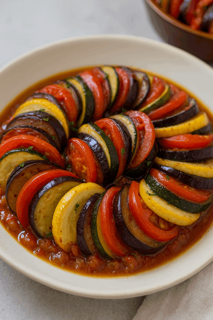Układaj je naprzemiennie (np. bakłażan–cukinia–pomidor–cukinia żółta) na sosie, tworząc okrąg lub rzędy.