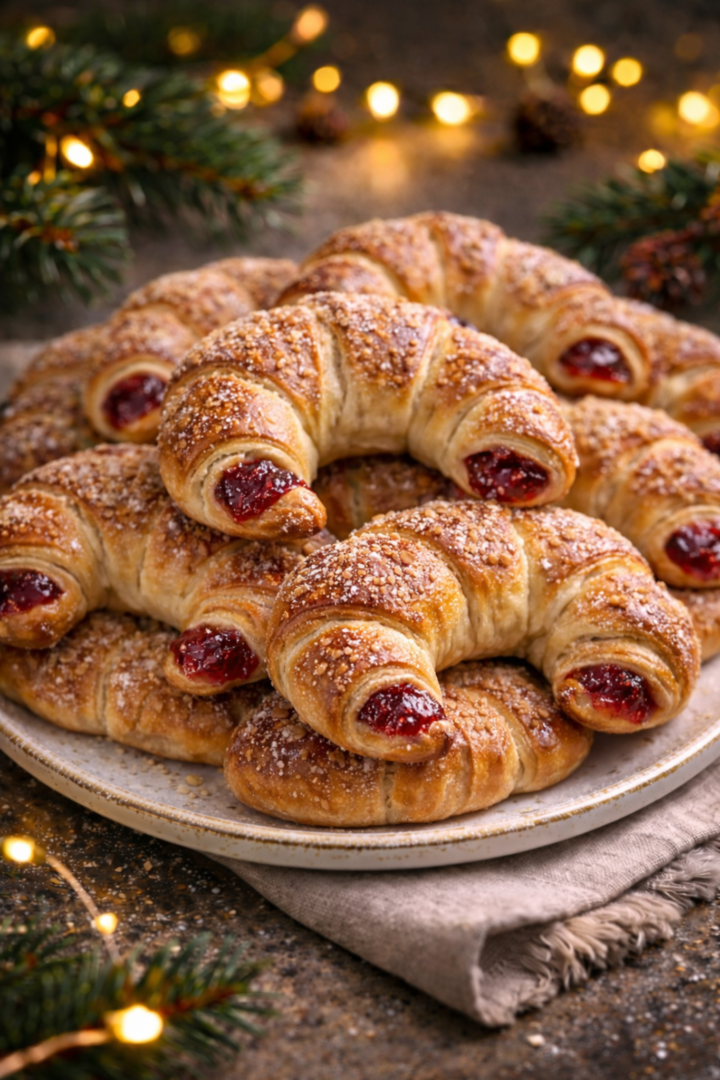 Ciasto rozwałkować na okrąg i podzielić na trójkąty. Na szerszy brzeg każdego nałożyć dżem i zwinąć w rogalik.