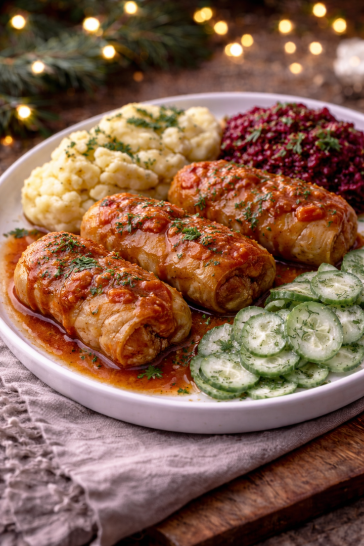 Podawaj roladki z sosem, puree ziemniaczanym, buraczkami i mizerią.