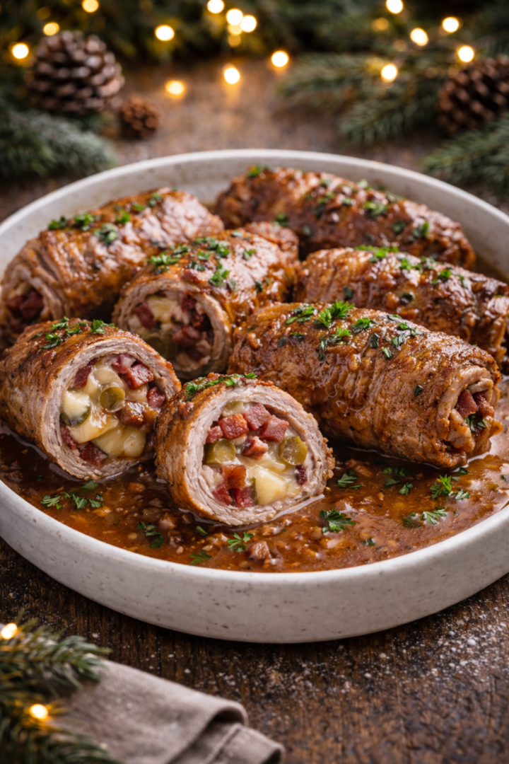 Roladki schabowe z boczkiem, serem i ogórkiem w sosie