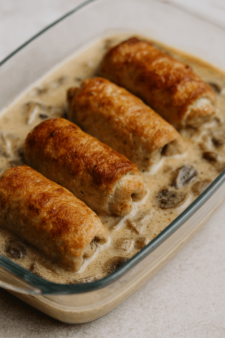 Roladki schabowe z pieczarkami w sosie pieczarkowym (zapiekane)