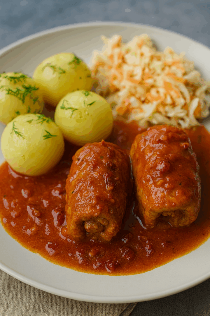 Roladki wieprzowe w sosie pomidorowym z ziemniakami i surówką